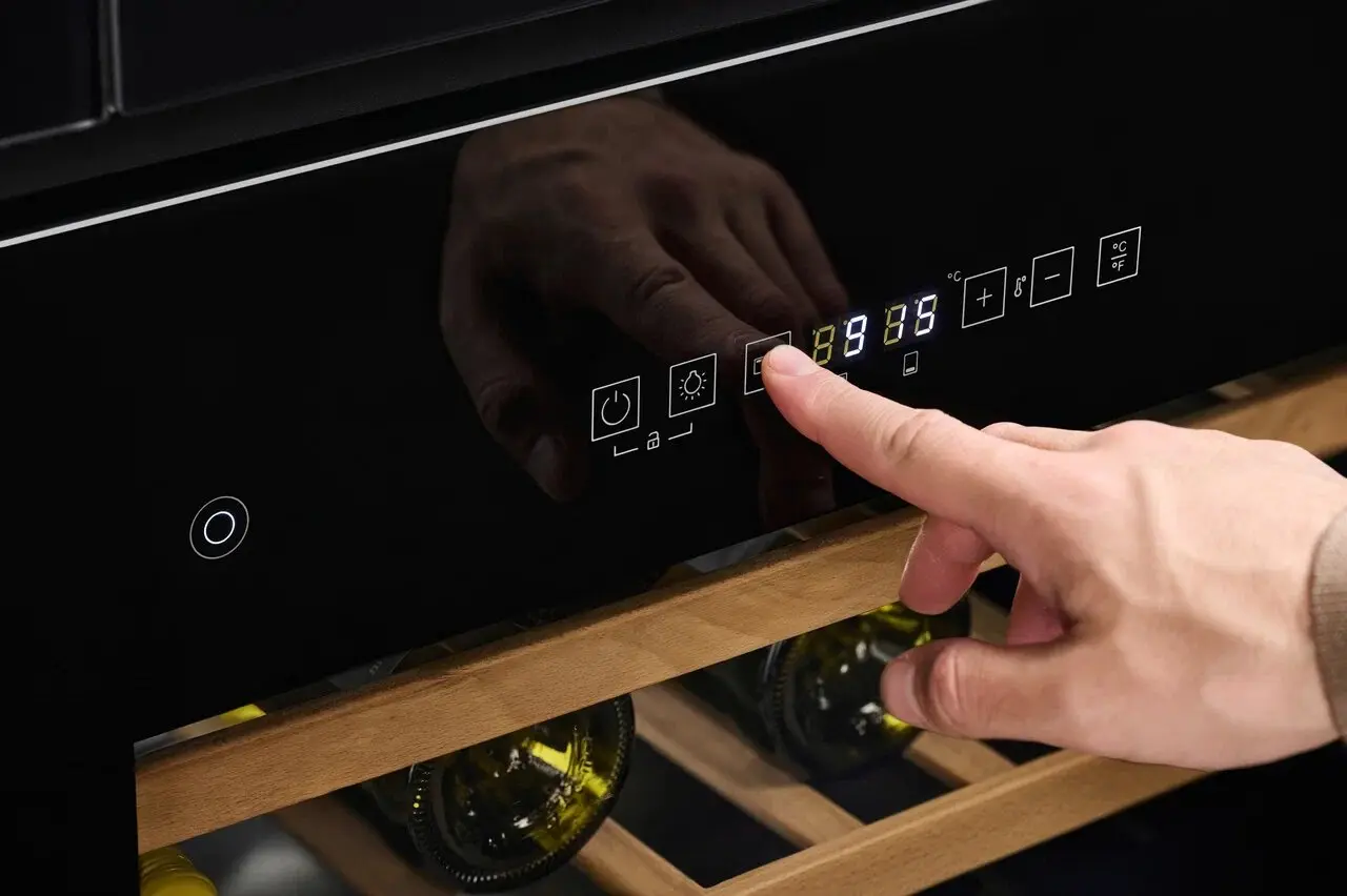 В отличие от стандартных моделей, сенсорное управление размещено на дверце, а не внутри холодильника. Чтобы изменить температуру хранения вина, его не нужно открывать, предотвращая тем самым попадание тепла в холодильник.
